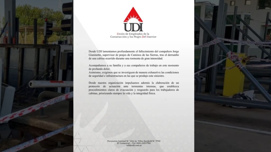 La Unión de Empleados de la Construcción y los Peajes del Interior (UDI) expresó su profundo pesar por la muerte de Jorge Gianinetto (61), el supervisor de la empresa Caminos de las Sierras que murió este jueves tras el derrumbe de una cabina en el peaje de la ruta 9 norte durante el fuerte temporal que afectó a Córdoba.